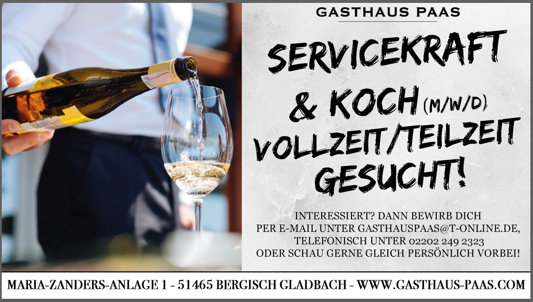 Für unser Gasthaus suchen wir ab sofort freundliche & engagierte Servicekraft und Koch (m/w/d) in Vollzeit oder Teilzeit. Interessiert? Dann bewirb dich per E-Mail: gasthauspaas@t-online.de, telefonisch unter 02202 249 2323 oder schau gerne gleich persönlich vorbei!